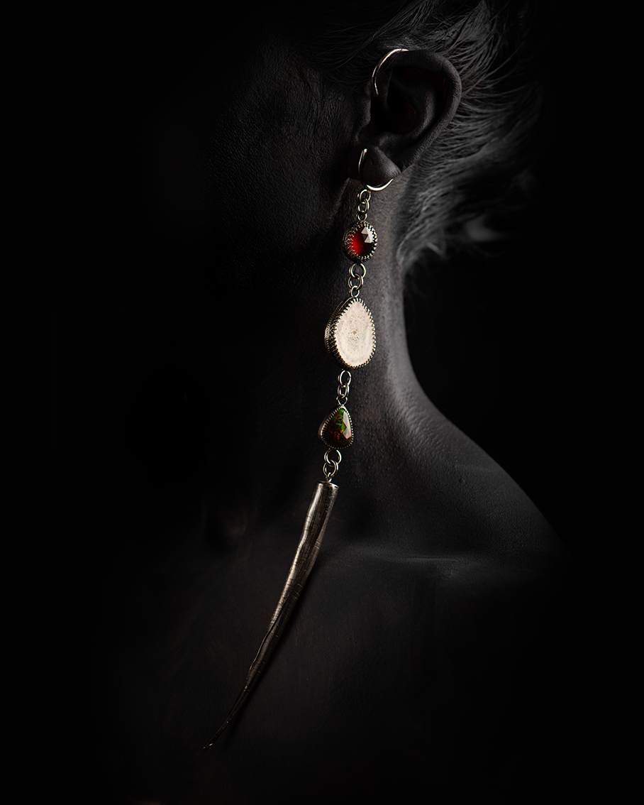 Strength: The spikes signify strength; and I have paired them with a carefully curated selection of gemstones in keeping with the red, black and white theme for the Triple Goddess.