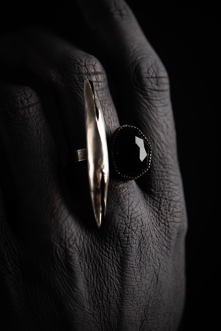 This collection draws its inspiration from Irish folklore and mythology - specifically the blackthorn tree - with symbology deeply connected to the faery world. The blackthorn is significant because of its inherent duality. On the one hand it is a symbol for strength, overcoming adversity, purification and protection. On the other hand, it is also considered a trickster, bad luck if crossed and easily used as a weapon in the wrong hands. The blackthorn is associated with death, battles and transformation. This can be seen in the three colours that are found in it - red (of the sap) represents blood, the white of the flowers represents the spirit and the black of the bark represents death. Because of this, the tree is closely associated with the Triple Goddess, and is especially sacred to the Irish Goddess, the Morrígan, who oversees matters of war, death and sexuality. My interpretation of the blackthorn was to produce pieces that are organic in form, represent strength, and are to be worn as a talisman.