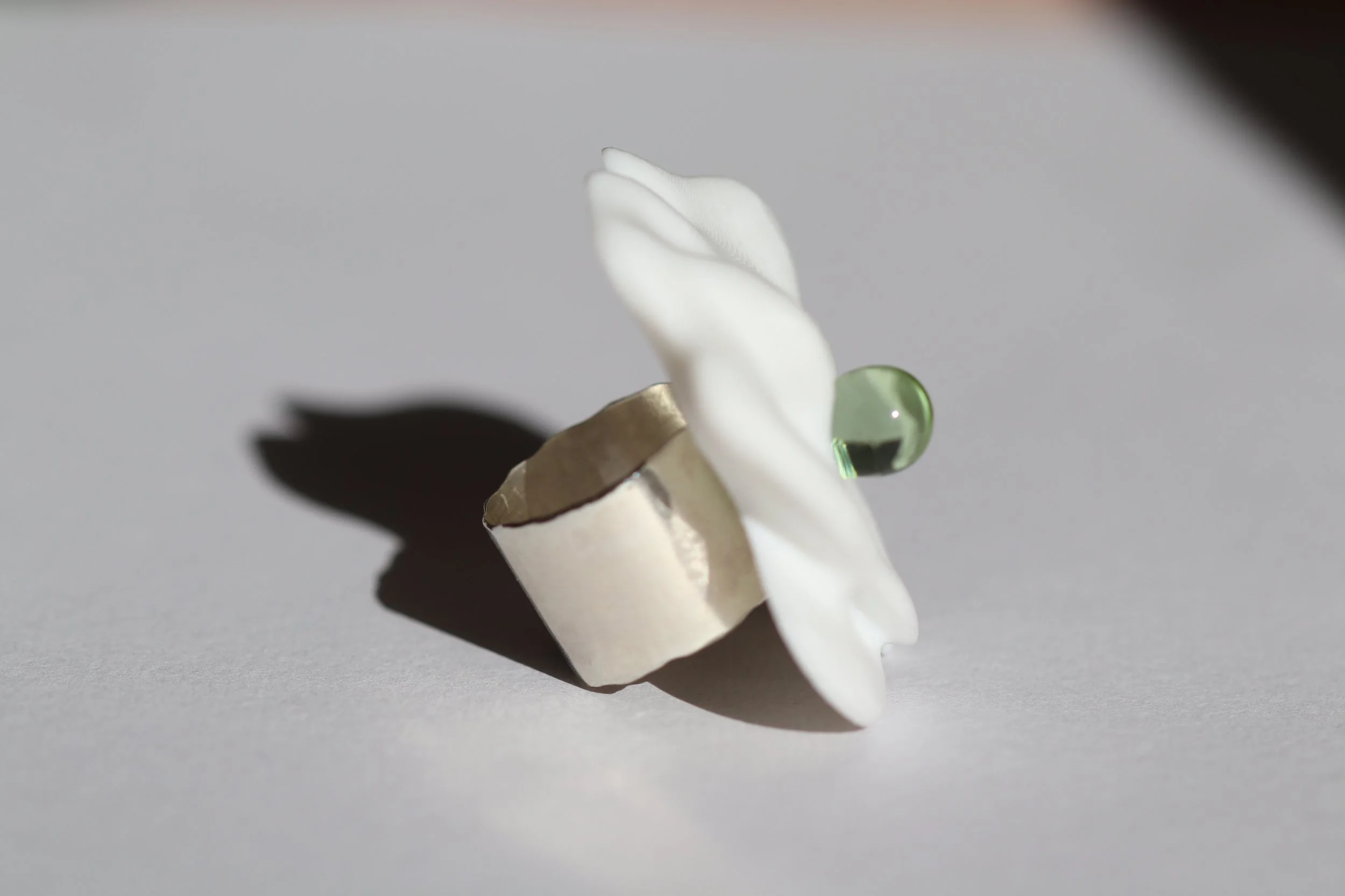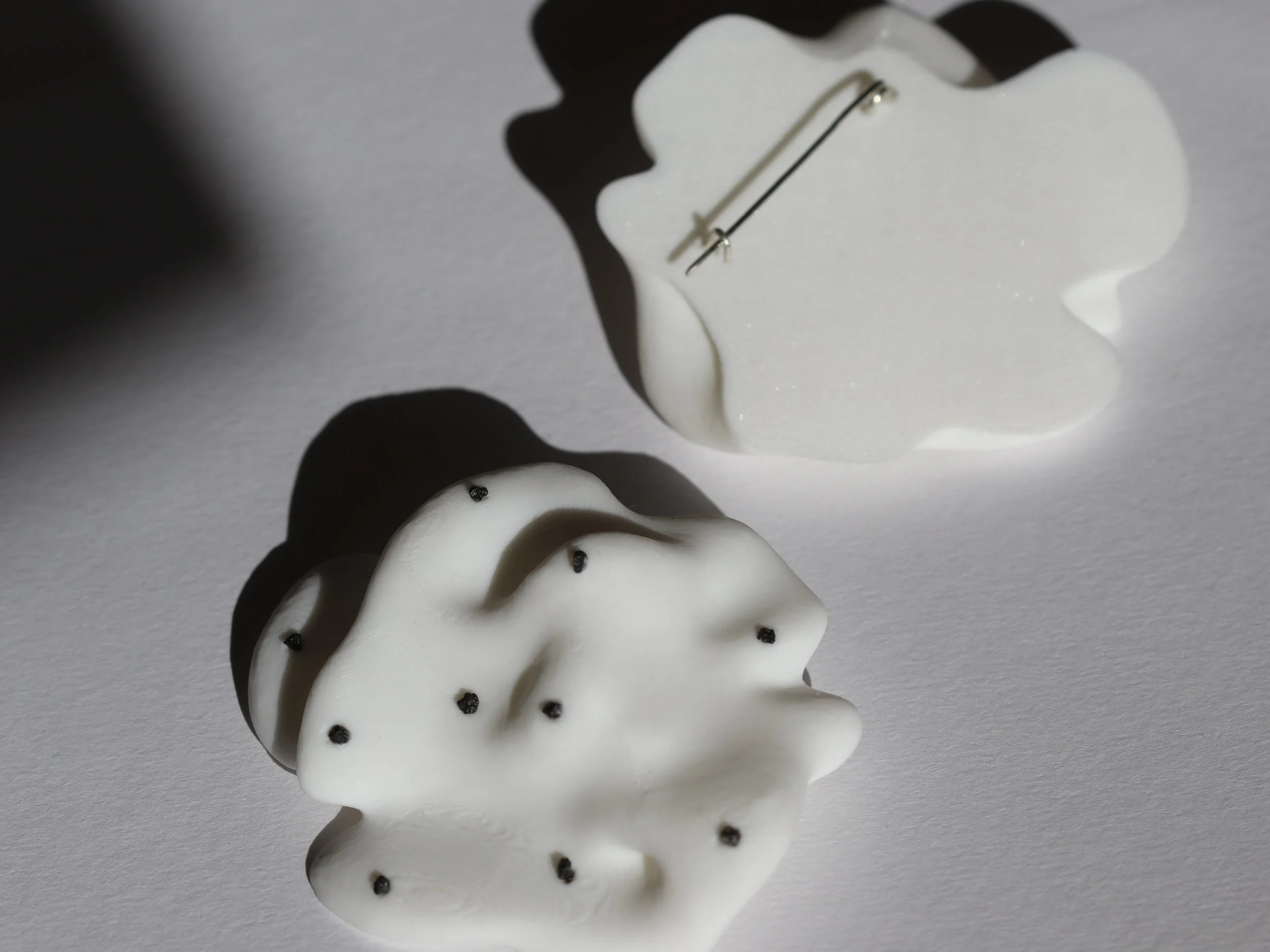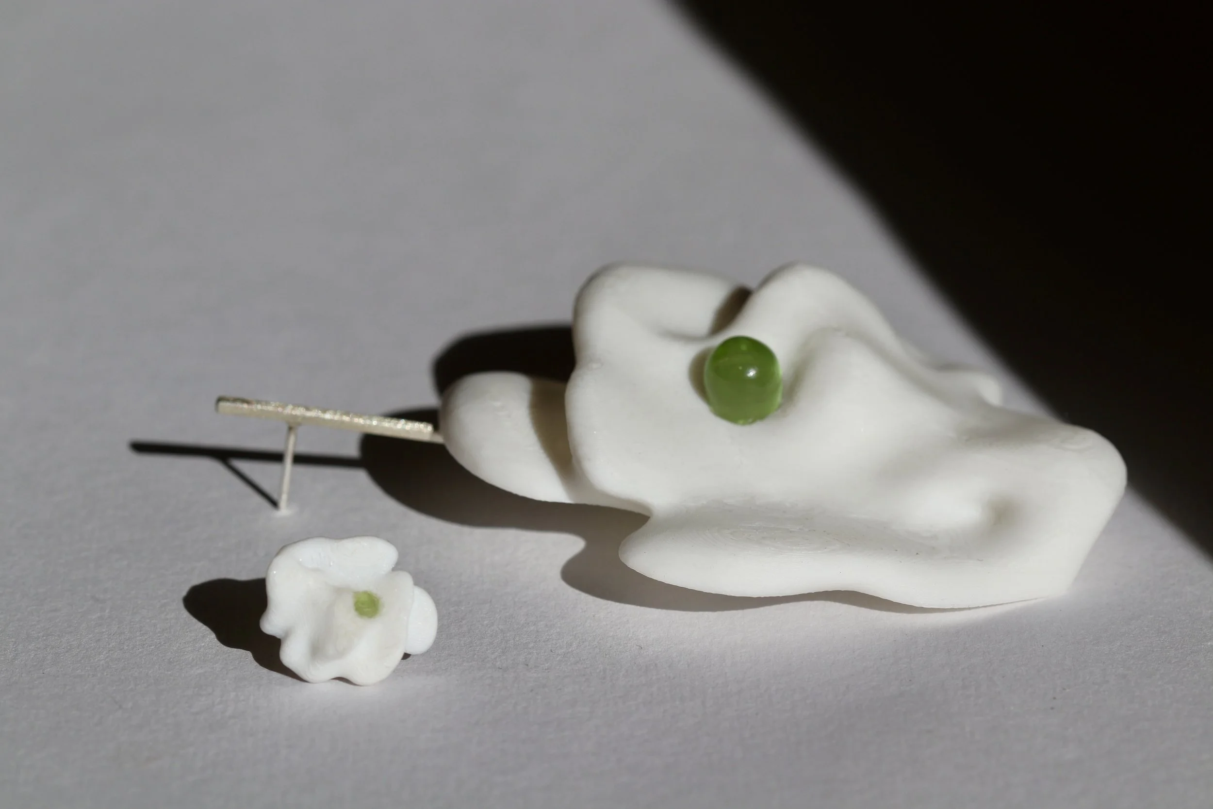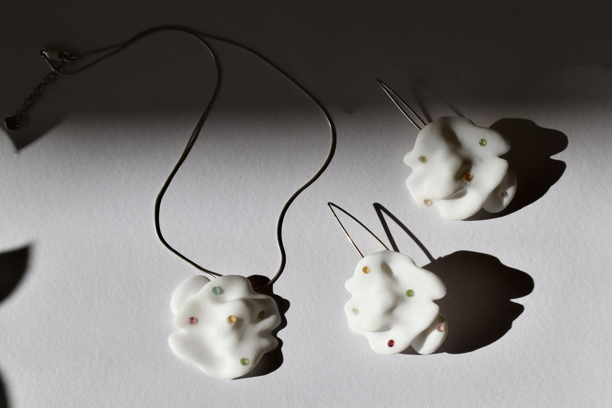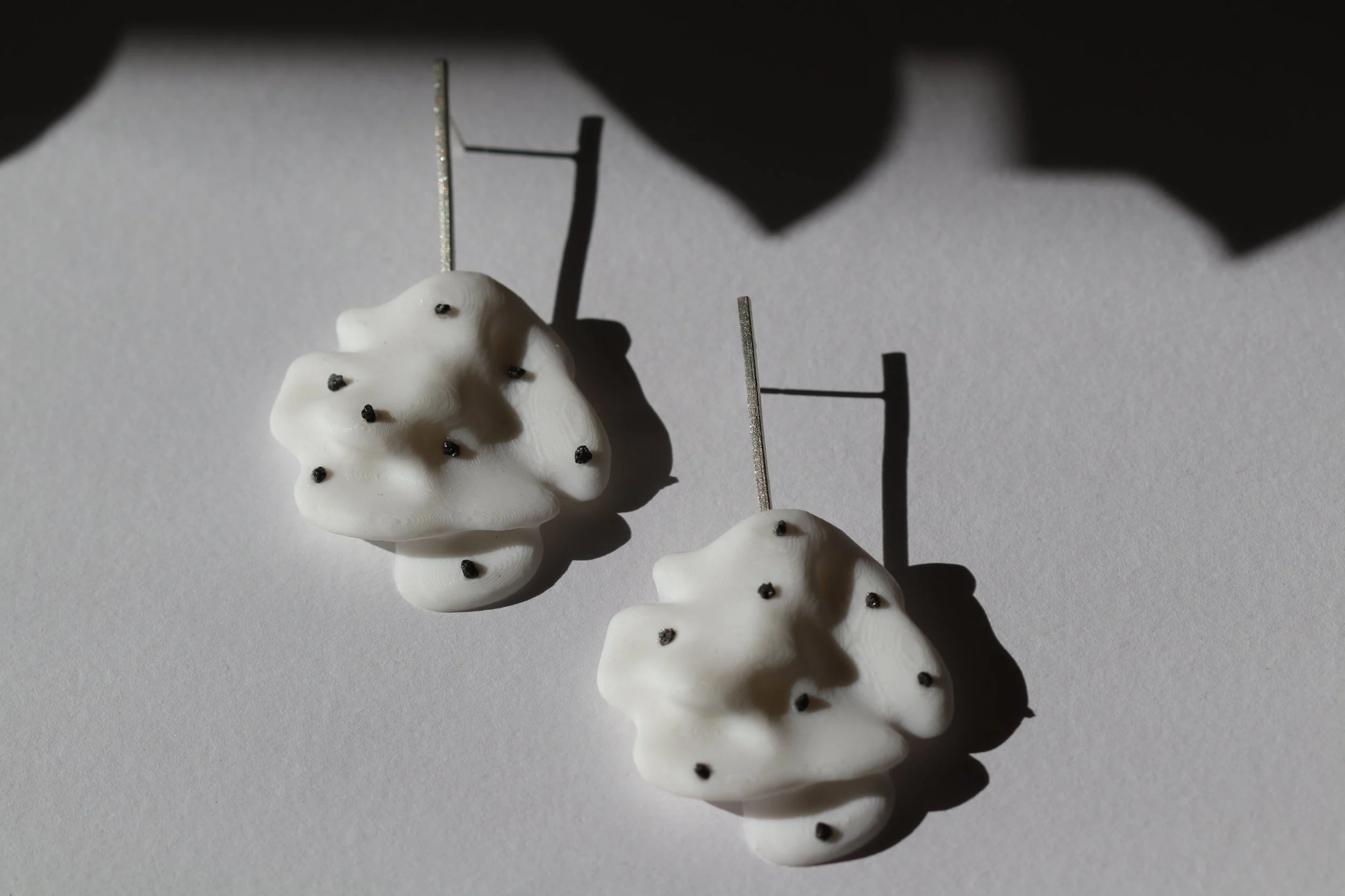 The "Clouds" collection is a collaboration between jeweler Elena Dobrovolsky and Israeli 3D designer Alex Dalevich. This collection brings traditional craftsmanship, contemporary trends, and precious gemstones into one bold artistic vision. Innovative Design: The signature white form of the collection was generated using Ai and then 3D-printed