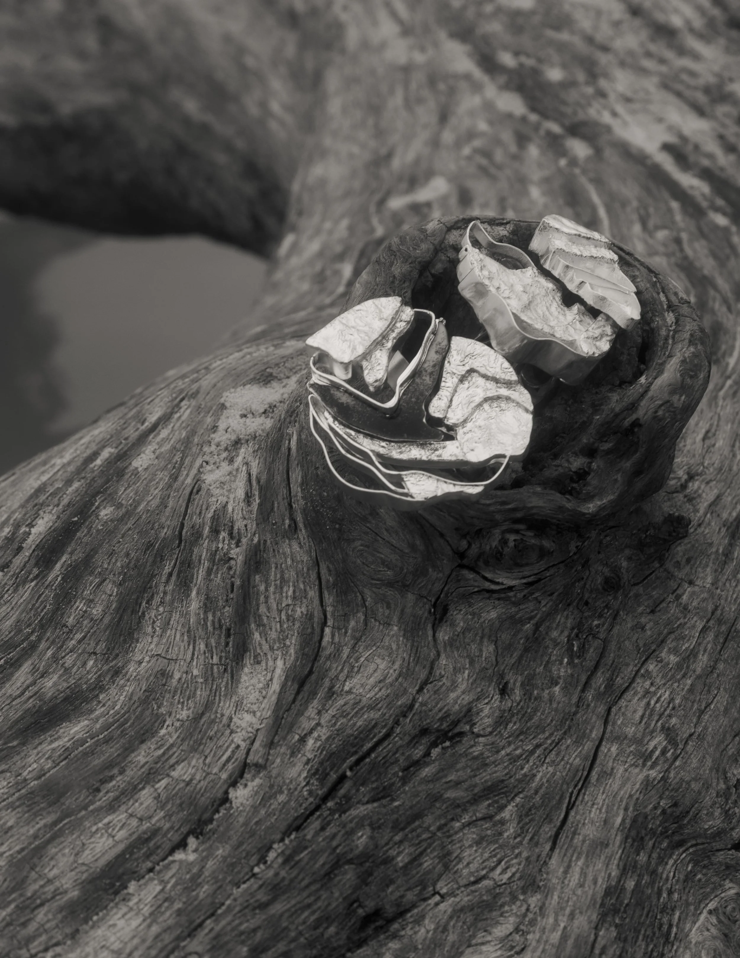Slopes, stairs, and distant mountain silhouettes—this was the rhythm of my early world, the quiet structure of the city I grew up in. Mountains stood silently on the edge of the Sichuan Basin, their outlines dissolving softly into the sky. They were never the center of attention, yet always there—unspoken but constant, etched deeply into memory. This is the image of home I carry with me: not loud, not monumental, but steady—shaping the way I see, feel, and create. In this collection, I work with reticulation, a fully hand-crafted technique where flame transforms metal into textured, organic surfaces. The unpredictable patterns reflect the randomness of nature—like erosion, like shifting rock—capturing both movement and stillness. Each piece holds the tactile essence of the landscape, abstracted into form. Jewelry, to me, is a vessel of memory. Mountain Identity is not a replica of a place, but a quiet return to it—a reminder of presence, origin, and emotional gravity that remains even as we move forward.