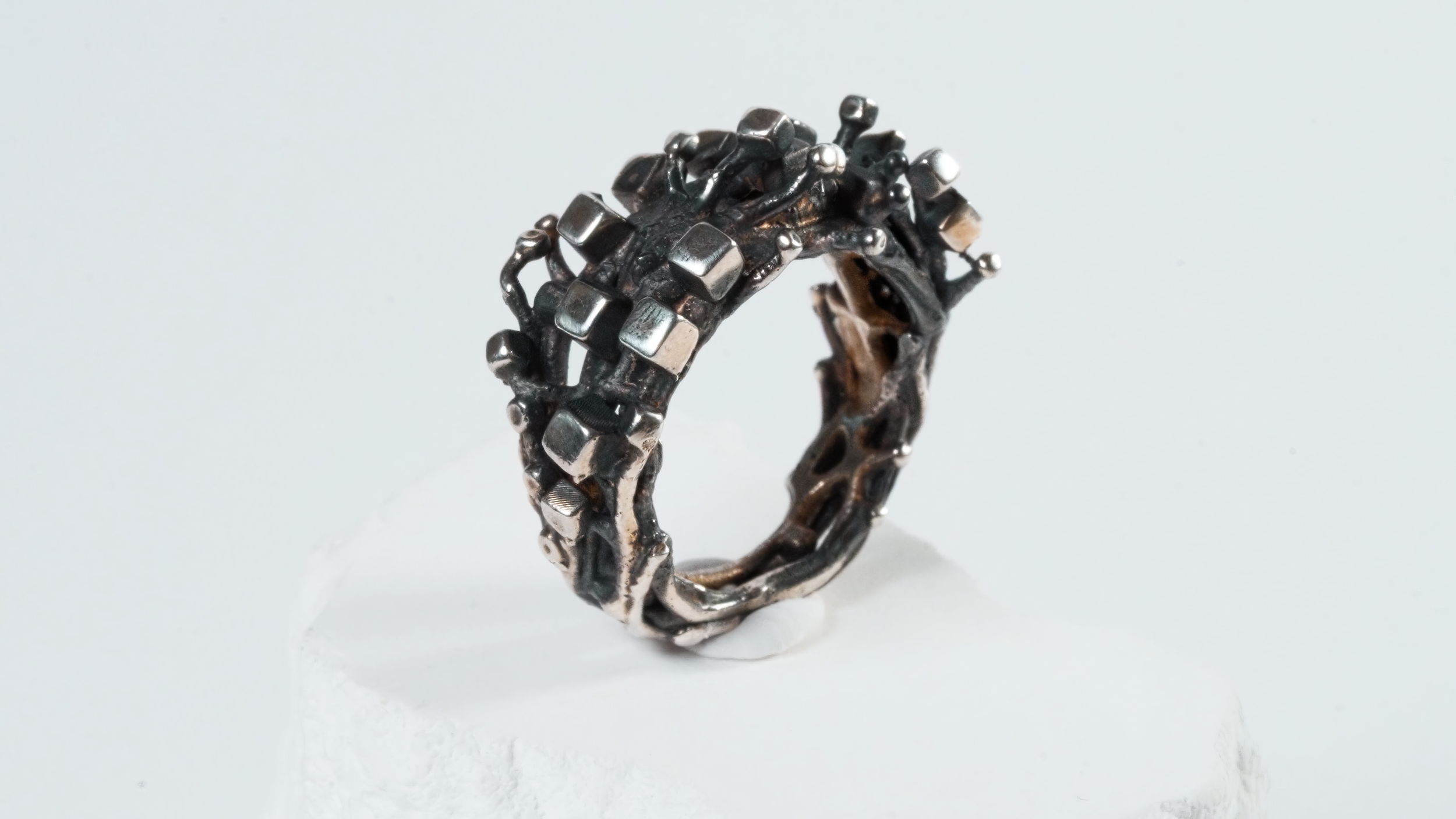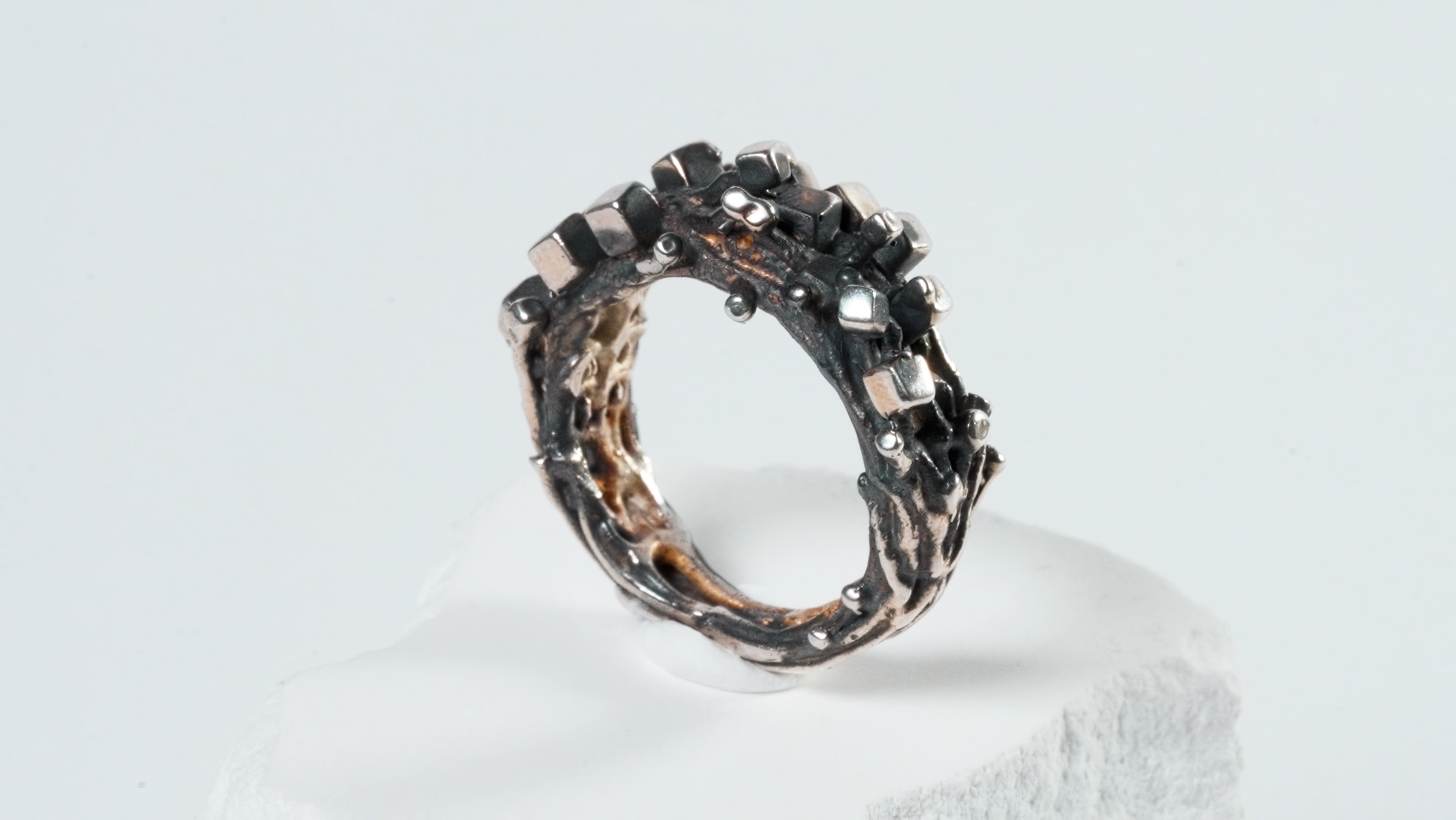 I reject false shine. I choose imperfection as truth. Instead of traditional tools that would crush my hands, I use 3D modeling, 3D scanning, artificial intelligence — not out of rebellion, but out of survival. Each piece of jewelry bears the brutal marks of creation: textures of tree bark and driftwood, imprinted in metal with a fingerprint captured through photogrammetry or generated through words. I work with honest matter, where light and shadow do not exclude each other, but complete one another. My brutalism is not cold — it is alive, it is true, it is a form of resistance against false perfection.