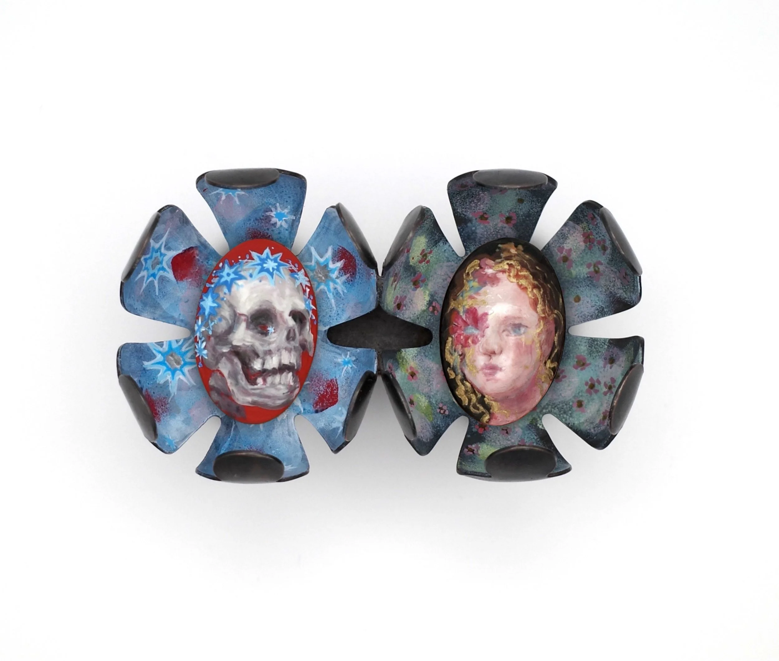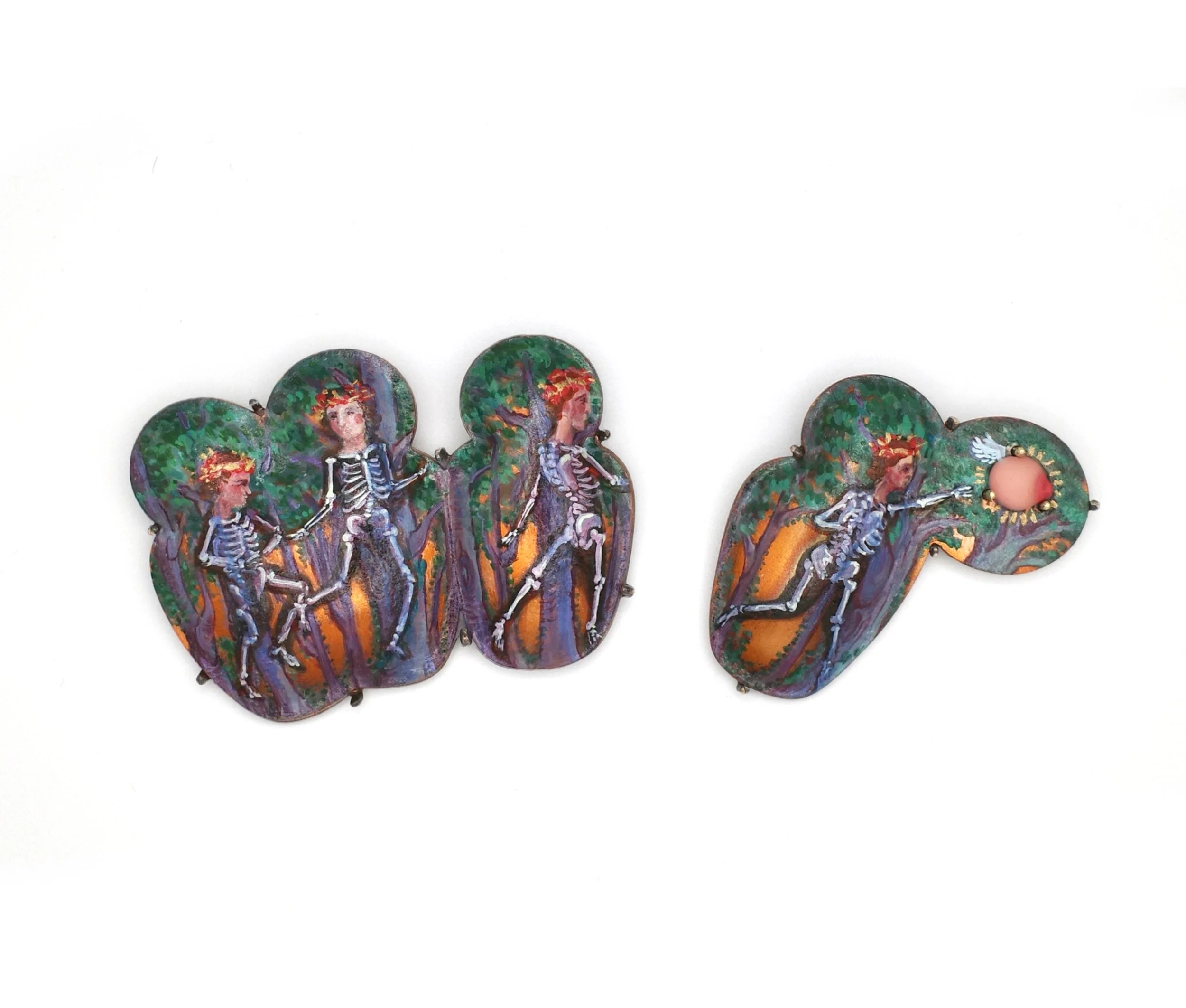 The Theatre of Life series is a conceptual jewellery collection that explores the cyclical nature of existence and the spiritual connections between birth, death, and the afterlife. Through sculptural, wearable pieces, the series reflects on universal themes of transformation, impermanence, and human emotions.The works merge traditional metalwork with contemporary painting techniques, emphasizing expressive colour and intricate storytelling.